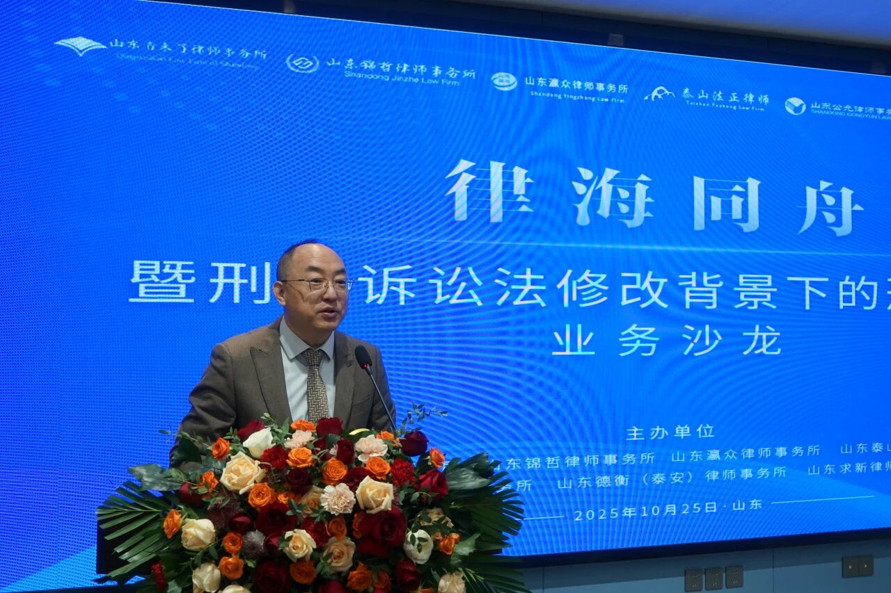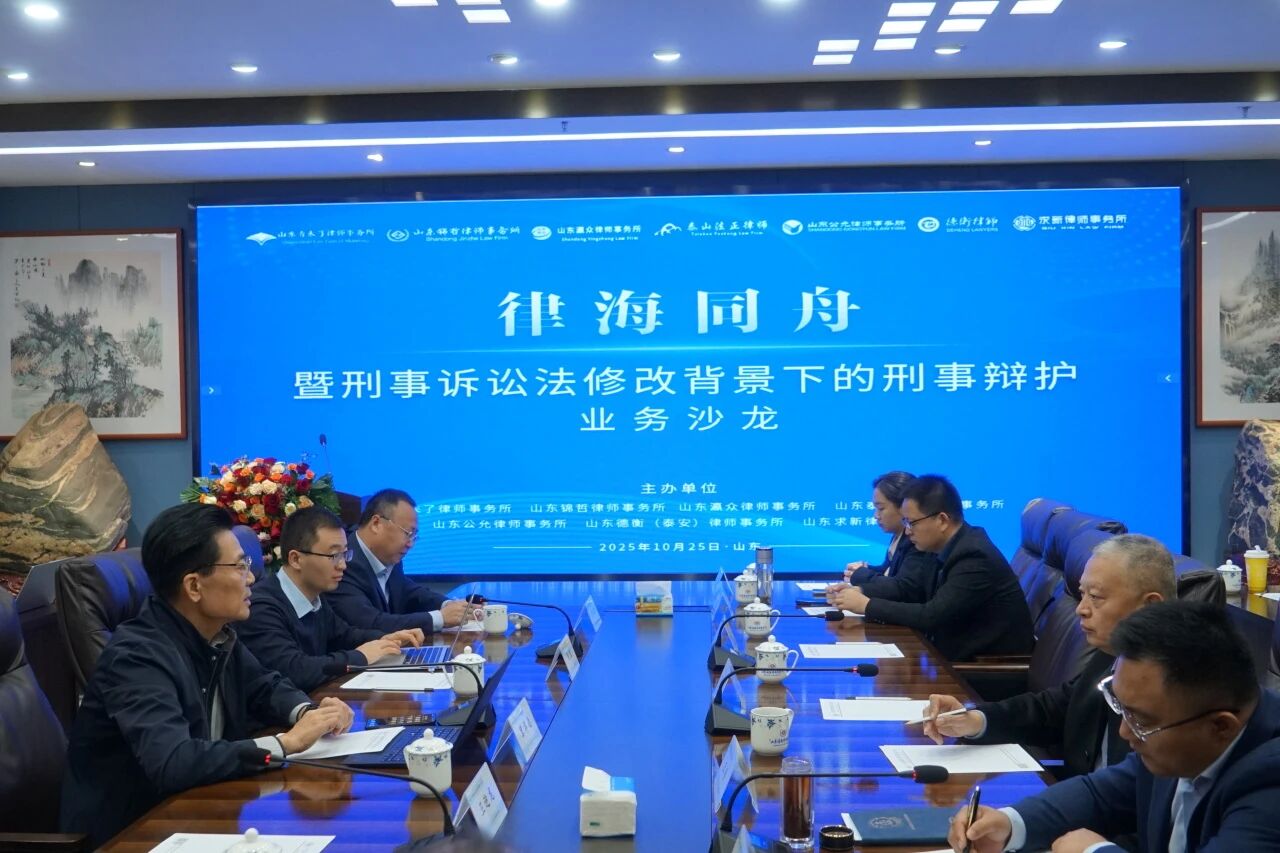 2025年10月25日,为了提升律师事务所、律师的品牌和文化建设、提高律师刑事辩护的理论和实操性,赋能律师事务所、律师成长、实现互助共赢,由山东青未了律师事务所、山东求新律师事务所、山东锦哲律师事务所、山东瀛众律师事务所、山东泰山法正律师事务所、山东公允律师事务所、山东泰山蓝天律师事务所、山东德衡(泰安)律师事务所联合举办的“律海同舟 暨刑事诉讼法修改背景下刑事辩护业务沙龙”活动在山东锦哲律师事务所大会议室举行。泰安市律师协会副会长、山东公允律师事务所主任毕俊斌,山东青未了律师事务所副主任彭广磊,山东泰山法正律师事务所合伙人刘元国,山东锦哲律师事务所主任张传旺,山东瀛众律师事务所主任韩永刚,山东求新律师事务所合伙人仉凯、山东德衡(泰安)律师事务所主任刘文涛,山东盈和盈律师事务所执行主任何明,山东鲁岳律师事务所主任王勇,山东一山律师事务所主任魏加耀,山东泰润律师事务所主任宋辉,山东纵观律师事务所副主任曹雅琪,山东山泰律师事务所副主任吴小林及泰城部分律师近60人与会参加学习交流。