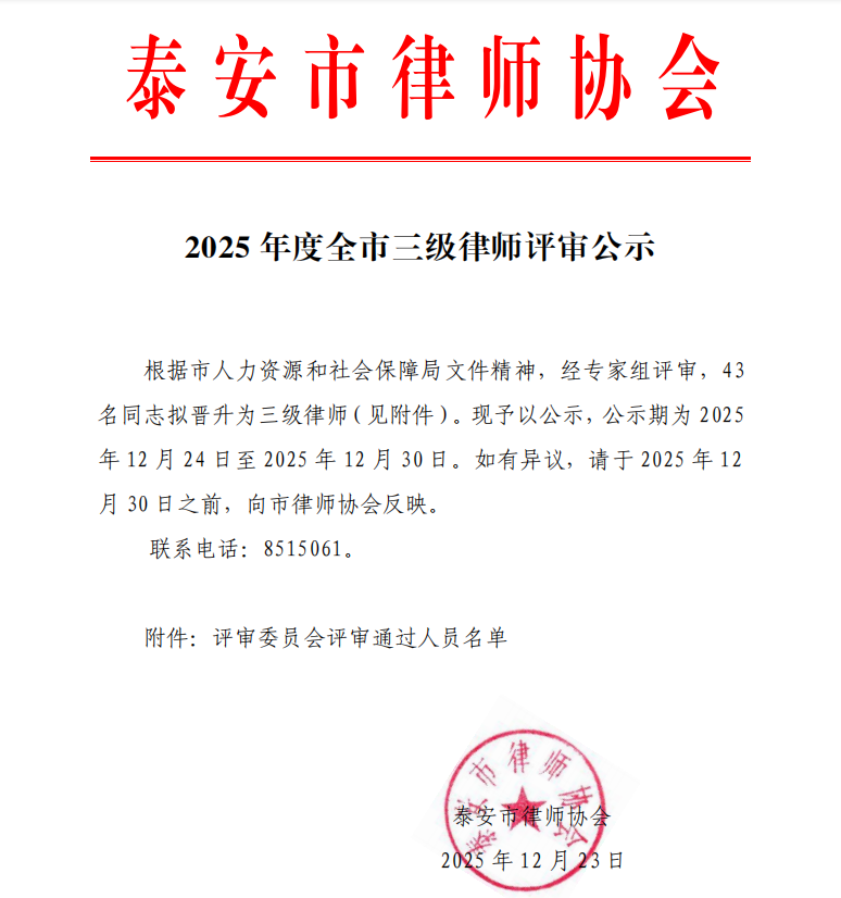 根据市人力资源和社会保障局文件精神,经专家组评审,43名同志拟晋升为三级律师(见附件)。现予以公示,公示期为2025年12月24日至2025年12月30日。如有异议,请于2025年12月30日之前,向市律师协会反映。