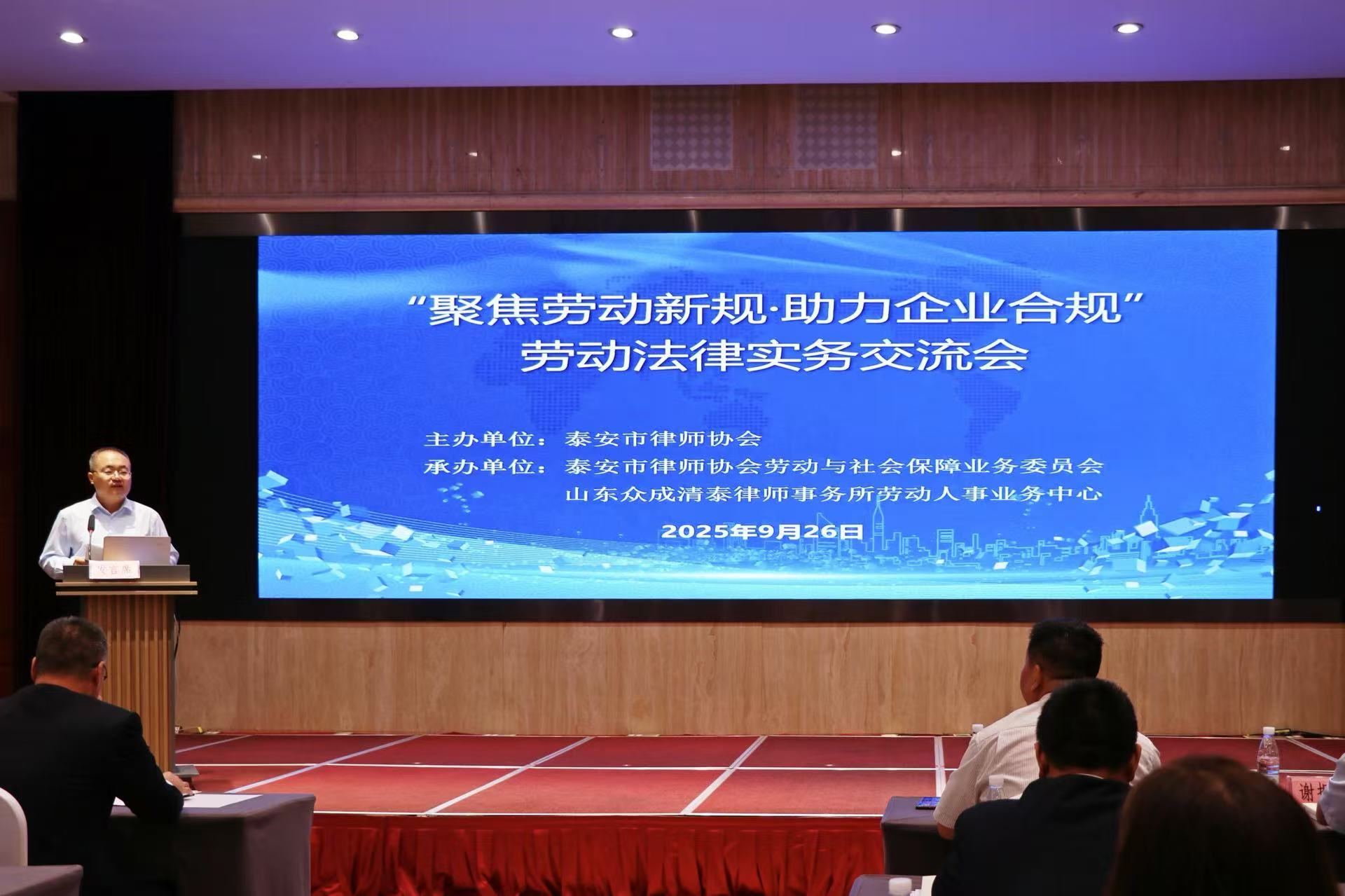 2025年9月26日,由泰安市律师协会主办,泰安市律师协会劳动与社会保障业务委员会与山东众成清泰律师事务所劳动人事业务中心联合承办的“聚焦劳动新规·助力企业合规”劳动法律实务交流会成功举办。会议采取线下线上相结合的方式进行,由泰安市律师协会劳动与社会保障业务委员会主任李蓬主持。