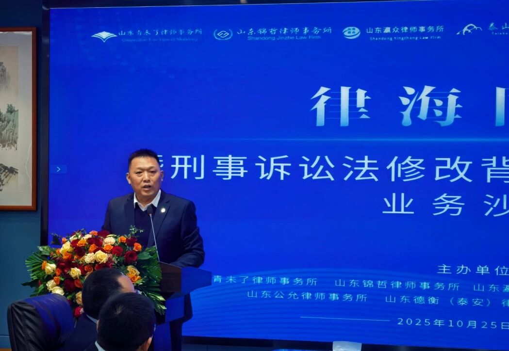 2025年10月25日,为了提升律师事务所、律师的品牌和文化建设、提高律师刑事辩护的理论和实操性,赋能律师事务所、律师成长、实现互助共赢,由山东青未了律师事务所、山东求新律师事务所、山东锦哲律师事务所、山东瀛众律师事务所、山东泰山法正律师事务所、山东公允律师事务所、山东泰山蓝天律师事务所、山东德衡(泰安)律师事务所联合举办的“律海同舟 暨刑事诉讼法修改背景下刑事辩护业务沙龙”活动在山东锦哲律师事务所大会议室举行。泰安市律师协会副会长、山东公允律师事务所主任毕俊斌,山东青未了律师事务所副主任彭广磊,山东泰山法正律师事务所合伙人刘元国,山东锦哲律师事务所主任张传旺,山东瀛众律师事务所主任韩永刚,山东求新律师事务所合伙人仉凯、山东德衡(泰安)律师事务所主任刘文涛,山东盈和盈律师事务所执行主任何明,山东鲁岳律师事务所主任王勇,山东一山律师事务所主任魏加耀,山东泰润律师事务所主任宋辉,山东纵观律师事务所副主任曹雅琪,山东山泰律师事务所副主任吴小林及泰城部分律师近60人与会参加学习交流。