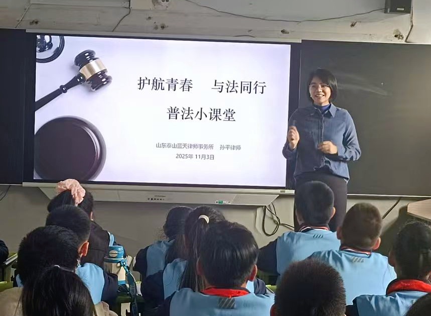 2025年11月3日,山东泰山蓝天律师事务所合伙人孙平走进泰安市第一实验学校,为五年级部分学生开展了题为“护航青春 与法同行--普法小课堂”的普法活动。